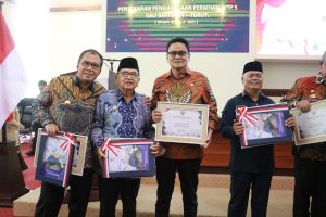 Saat menerima Plakat dan piagam penghargaan. Bupati Barru Ir. Suardi Saleh, M.Si yang didampingi Sekretaris Daerah dan Kepala BKAD menerima kado spesial sehari sebelum milad kelahiran bupati yang jatuh pada tanggal 2 Desember 2022.